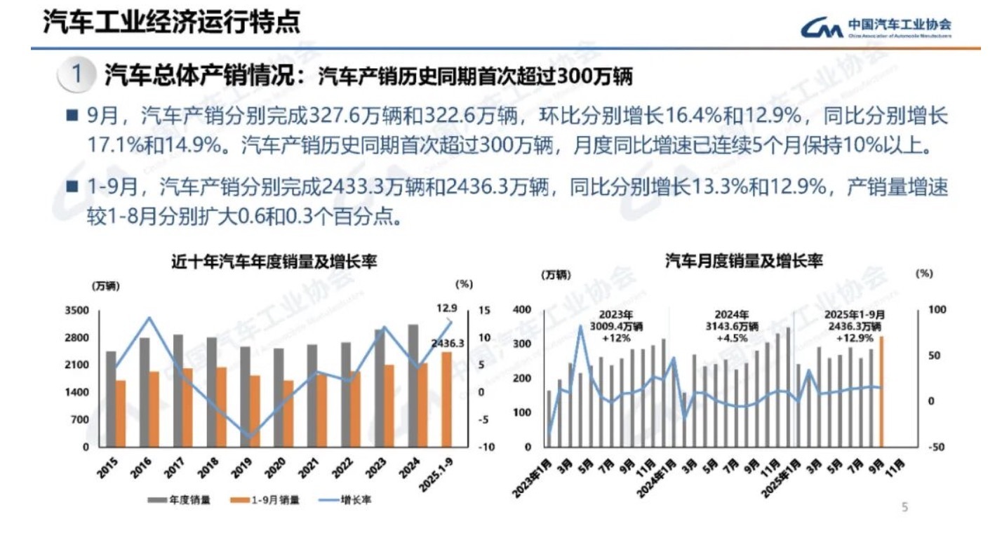 10月14日配资查询官网,中国汽车工业协会发布数据显示,今年9月我国汽车产销分别完成327.6万辆和322.6万辆,环比分别增长16.4%和12.9%,同比分别增长17.1%和14.9%。汽车产销历史同期首次超过300万辆,月度同比增速已连续5个月保持10%以上。